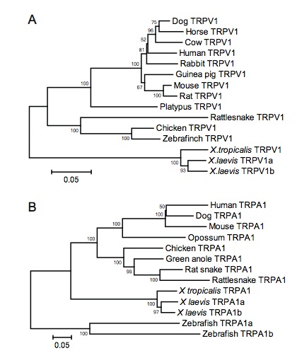 FIGURE 2. Phylogenetic relationship of vertebrate TRPV1 and TRPA1 including Xenopus species (A and B) Evolutionary distances were estimated by comparing amino acid sequences and phylogenetic trees were reconstructed with the Neighbor-Joining method (24). Statistical confidence (bootstrap value) is shown beside each node of the phylogenetic tree. Scale bar indicates 0.05% amino acid substitutions per site.