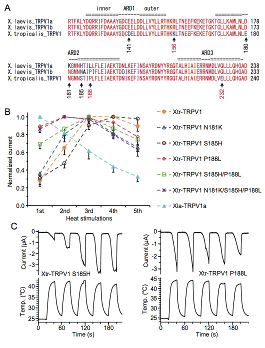 and Xtr-TRPV1 S185H/P188L; the fourth for Xtr-TRPV1 and Xtr-TRPV1 S185H) (C) Representative traces for current and temperature in response to repeated heat stimulation in Xenopus oocytes expressing Xtr-TRPV1 S185H (left) and Xtr-TRPV1 P188L (right)