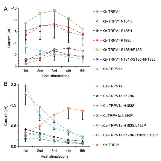 Average current amplitudes elicited by repeated heat stimulation in Xenopus oocytes expressing Xenopus TRPV1 mutants (A: n = 7 for Xtr-TRPV1, n = 9 for Xtr-TRPV1 N181K, n = 6 for Xtr-TRPV1 S185H, n = 9 for Xtr-TRPV1 P188L, n = 8 for Xtr-TRPV1 S185H/P188L, n = 9 or 10 for Xtr-TRPV1 N181K/S185H/P188L, n = 5 for Xla-TRPV1a, B: n = 5 for Xla-TRPV1a, n = 10 for Xla-TRPV1a K179N, n = 7 for Xla-TRPV1a H183S, n = 7 for Xla-TRPV1a L186P, n = 8 for Xla-TRPV1a H183S/L186P, n = 8 for Xla-TRPV1a K179N/H183S/L186P, n = 7 for Xtr-TRPV1). For each of the channels, the same amount of cRNA was injected into the Xenopus oocytes and current measurements were performed 3 days post-injection.