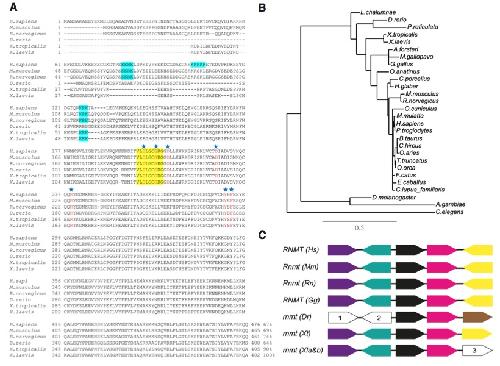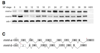 Fig. 2.Temporal expression and comparison of rnmt paralogs. (A) The nucleotide sequence of the fragment used to compare spatial expression of rnmt-a and -b is shown. Sequences used for primer pairs are in red. Intron spanning primers were used to exclude any contamination from genomic DNA. Primer pairs, specific to each of both loci were used to compare the temporal expression of the paralogs.