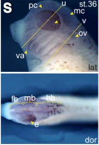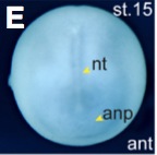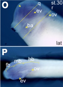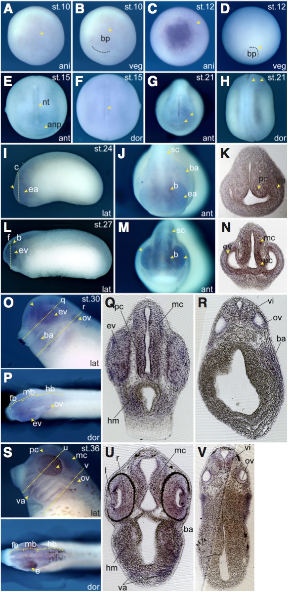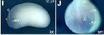 rnmt (RNA (guanine-7-) methyltransferase) gene expression in Xenopus laevis embryo, assayed via in situ hybridization, NF stage 24,(I): lateral view, anteriorleft, dorsal up, and( J) anterior view, dorsal up.
