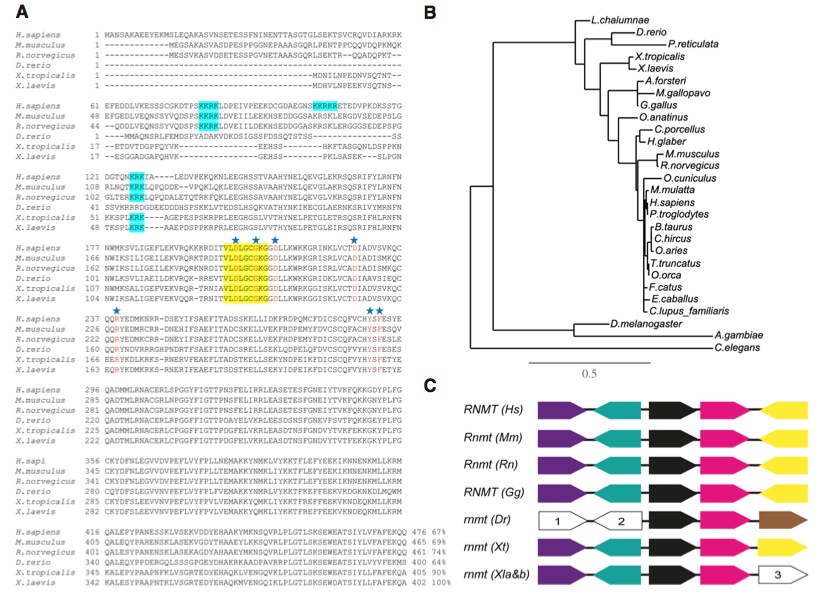 Figure 2. (continued) (B) Semi-quantitative rt-PCR revealed zygotic expression of rnmt-a, whereas rnmt-b shows maternal presence. Housekeeping gene ODC1 was used as a control for equal RNA input. (C) Genomic profile of both the loci âaâ and âbâ. Grey boxes indicate exons and lines joining them the intronic regions of the gene. Forward arrow repre-