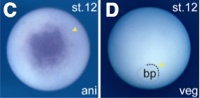 rnmt (RNA (guanine-7-) methyltransferase) gene expression in Xenopus laevis embryo, assayed via in situ hybridization, NF stage 12, animal view (C) and vegetal view (D).
