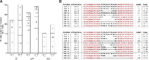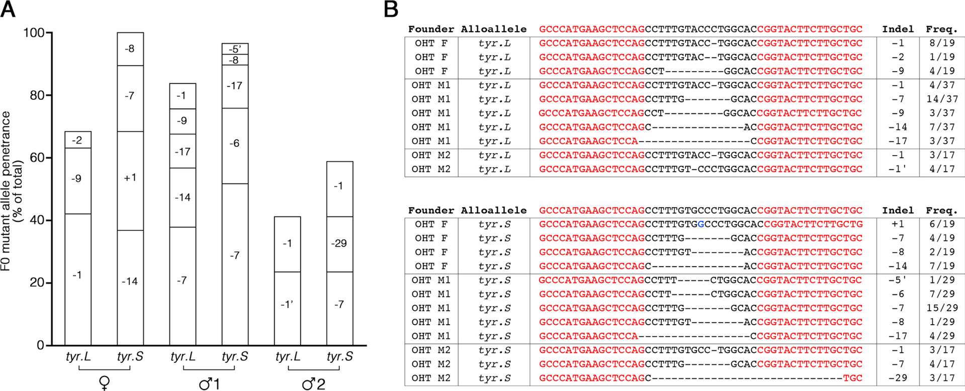 Fig. 2. Genotyping of F1 tyr mutant embryos. (A) Bar graph illustrating the frequency of tyr.L and tyr.S mutations in F1 embryos generated by mating F0 OHT frog with wild type J strain. Wild type alleles make up the remainder of each column. (B) Sequence of mutations identified in F1 embryos. Frequency refers to the number of F1 embryos that contained the mutation. Red font indicates TALEN target sites.