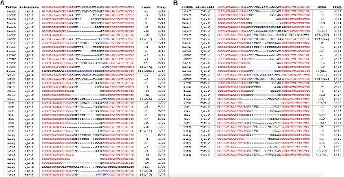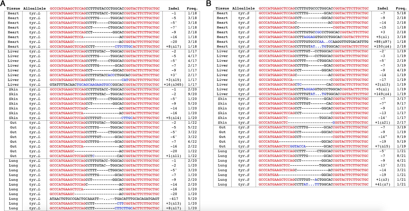 Fig. 3. Genotyping of F0 somatic tissue of female OHT tyr mutant frog. (A) Sequence of tyr.L mutations identified in the heart, liver, skin, gut and lung of F0 female OHT frog. (B) Sequence of tyr.S mutations identified in heart, liver, skin, gut and lung of F0 female OHT frog. Frequency refers to the number of clones that contained the mutation. Red font indicates TALEN target sites.