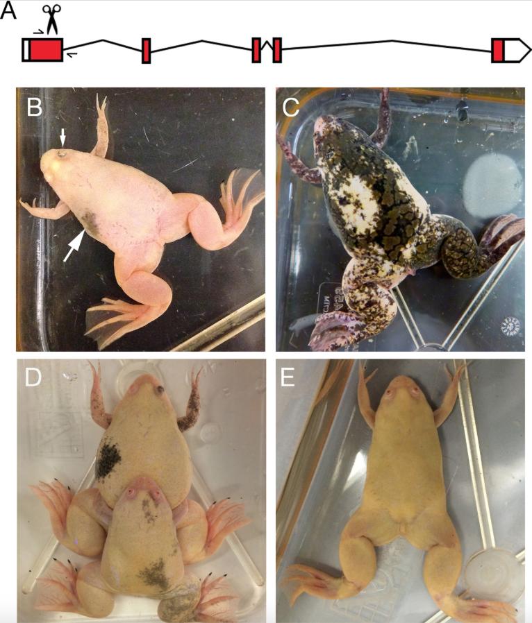 Fig. 1. Examples of F0 and F1 X. laevis tyr mutants. (A) Schematic diagram of tyrosinase locus, showing the five exons. The scissors show where the TALENs were designed to target the 3â² end of the first exon, and the arrows show the location of primers used for genotyping. (B) Picture of an 8-month-old tyr mutant F0 J strain frog generated by oocyte host transfer. Notice small patch of pigmentation in the body and eye (arrows). (C) Picture of an 8-month-old F0 tyr mutant frog generated by injection of TALEN mRNAs into one-cell stage embryos. (D) Picture of natural mating of two tyr mutant F0 frogs (OHT female and OHT male #1) at 14 months. (E) Picture of an F1 tyr mutant frog from mating of OHT female and OHT male #1 at 6 months of age.