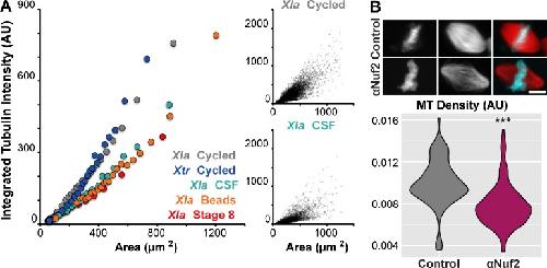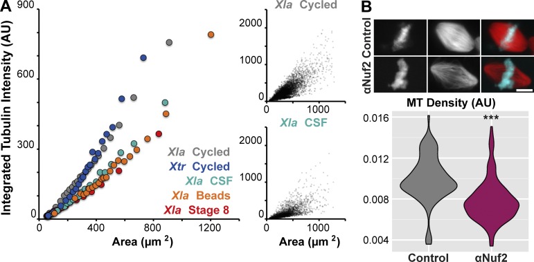 Figure 4. Kinetochore fibers increase spindle microtubule density. (A) Relationship between spindle area and total tubulin fluorescence intensity for spindle types showing differences in microtubule density among spindle types. Large plot shows data averaged across 21 equally sized cross-sectional area bins, and small plots show raw data for X. laevis cycled and CSF spindles. (B) Example images and microtubule density violin plots for IgG control (n = 117) and Nuf2 antibody inhibition (n = 230) showing decreased microtubule density after interfering with kinetochore microtubule formation. ***, P < 10â13 for a two-sample KolmogorovâSmirnov test.