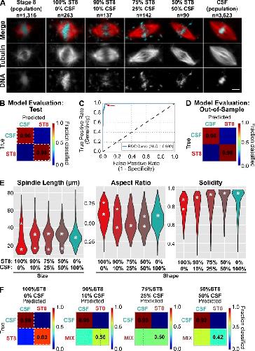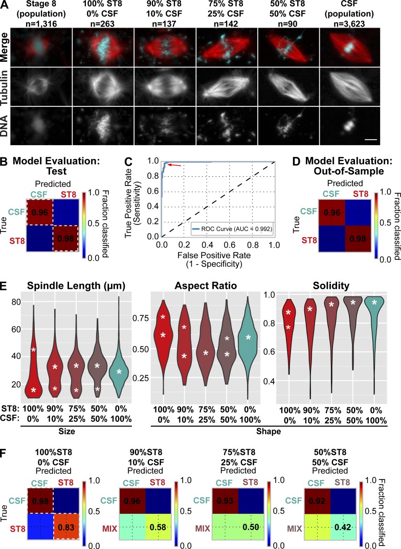Figure 5. Meiotic cytoplasm has a dominant effect on spindle morphology. (A) Example images of X. laevis spindles formed in stage 8, CSF, and mixed extracts. Bar, 10 µm. (B) Cross-validation based evaluation of classification model (generalized linear model, LASSO-penalized logistic regression) on a CSF/stage 8 (ST8) spindle quantification test set (not used for training). Color scale ranges from blue (0% of objects classified to the group) to red (100% of objects classified). White dashed line indicates correctly classified objects with classification accuracy marked. (C) Receiver-operating characteristic (ROC) curve, an alternative assessment of the classification model performance for the model in B with area under the curve (AUC) marked. Optimal probability threshold for the logistic regression model (red arrow indicates maximum sensitivity and specificity) is 0.6. AUC is 0.99 (perfect model, with 100% specificity and 100% sensitivity would have AUC = 1.0). (D) Evaluation of classification model from Fig. 3 A on out-of-sample data. Accuracy for correctly classified spindles is marked (main diagonal, dark red). (E) Violin plots showing distributions of spindle length, aspect ratio, and solidity for structures assembled in stage 8, CSF, or mixed extracts (see also Fig. S3). White asterisks correspond to inferred maxima of distributions (Materials and methods). Major maxima are in bold. (F) The classification model (B–D) accurately distinguished CSF and stage 8 spindles but failed to accurately classify stage 8 spindles in mixed extracts.