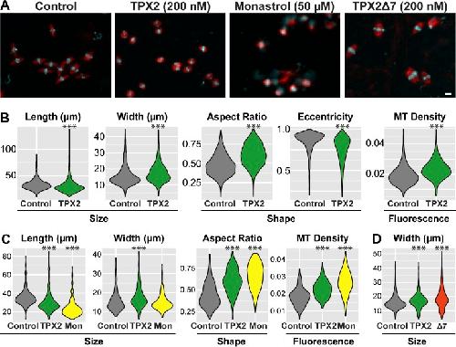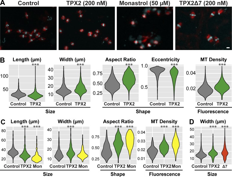 Figure 6. TPX2 influences spindle size, shape, and microtubule density. (A) Example images of spindles assembled in the absence (n = 1,935) or presence of 200 nM X. laevis TPX2 (n = 2,621), 50 µM Monastrol (n = 278), or 200 nM TPX2Δ7 (n = 1,417; Helmke and Heald, 2014). Bar, 10 µm. (B) Violin plots showing the distribution of spindle length, width, aspect ratio, eccentricity, and microtubule density for spindles formed in control (n = 1,935) or 200 nM TPX2-supplemented extracts (n = 2,621). ***, P < 10−15 for a two-sample Kolmogorov–Smirnov test with Bonferroni correction. (C) Violin plots showing the distributions of spindle length, width, aspect ratio, and microtubule density for spindles formed in control (n = 221), 200 nM TPX2–supplemented (n = 378), and 50 µM Monastrol (Mon)-treated (n = 278) extracts. ***, P < 10−15 for a two-sample Kolmogorov–Smirnov test. (D) Violin plots showing spindle width distributions for structures formed in control (n = 1,006), 200 nM wild-type TPX2–supplemented (n = 914), and 200 nM TPX2Δ7 (Δ7)-supplemented (n = 1,417) extracts. ***, P < × 10−15 for a two-sample Kolmogorov–Smirnov test.