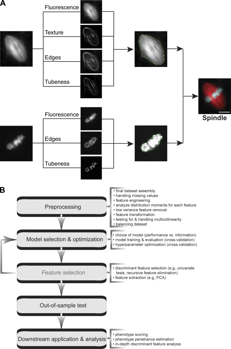 Figure 1. Highly accurate spindle segmentation allows quantitative analysis of the Xenopus extract spindle. (A) Segmentation scheme for Xenopus extract spindles relies on fluorescence, texture, edges, and tubeness for microtubule structures and fluorescence, edges, and tubeness for chromatin. Bar, 10 µm. All of the raw images analyzed are available at ftp://xenbaseturbofrog.org/. (B) Multivariate data analysis workflow for the data generated by CellProfiler pipeline. Most of the steps listed were applied to the analysis corresponding to Figs. 5, 6, S2, and S3, and the code is available at https://github.com/MultivariateSpindleResource/Super-Spindle-DataSet.