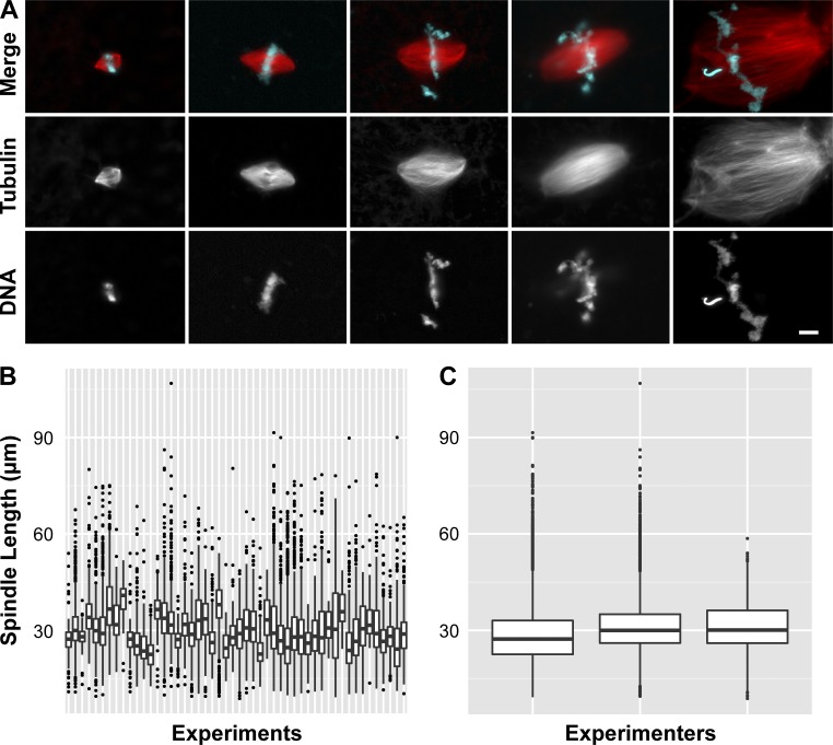 Figure 2. Xenopus egg extract spindles vary in morphology but converge to a consistent median length. (A) Examples showing variability in spindle morphology within a single egg extract reaction. Bar, 10 µm. (B) Boxplots for spindle lengths across 50 independent control experiments. Horizontal lines correspond to median spindle lengths. Bottom and top of the boxes are first and third quartiles, respectively; whiskers show highest and lowest values within 1.5 times the interquartile range and outliers are plotted as single points. (C) Distributions of spindle lengths from 50 independent experiments are shown in Fig. 1 B, grouped by three different experimenters.