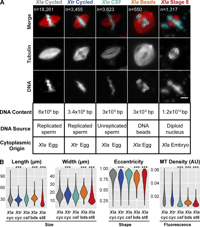 Figure 3. Cytoplasmic and chromatin composition affect spindle morphology. (A) Example images of the different spindle types. Table shows differences in source of DNA and cytoplasm used to form each spindle type as well as differences in DNA content among spindle types. Image inset indicates the number of structures analyzed for each spindle type. Xla, X. laevis; Xtr, X. tropicalis. Bar, 10 µm. (B) Violin plots showing distributions for spindle length, width, eccentricity, and microtubule density, measured as median rhodamine tubulin fluorescence intensity. ***, P < 10−13 for a two-sample Kolmogorov–Smirnov test with Bonferroni correction for multiple testing compared to X. laevis cycled spindles.