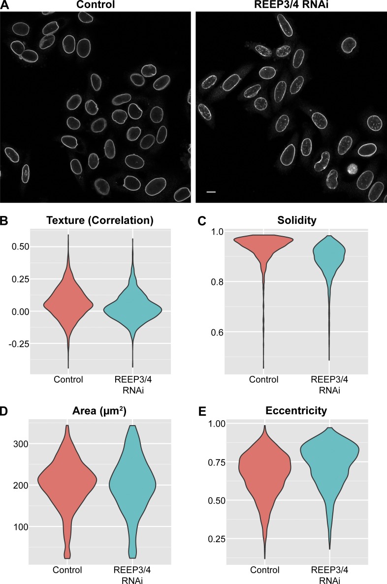 Figure 7. Image analysis pipeline can be adapted to other subcellular structures. (A) Example images of control and REEP3/4-depleted nuclei (Schlaitz et al., 2013). Bar, 10 µm. (B) Violin plot of Lamin B1 texture for control cells (n = 2,123) and REEP3/4-depleted cells (n = 1,763). (C) Violin plot of nuclear solidity for control cells (n = 2,123) and REEP3/4-depleted cells (n = 1,763). (D) Violin plot of nuclear area for control cells (n = 2,123) and REEP3/4-depleted cells (n = 1,763). (E) Violin plot of nuclear eccentricity for control cells (n = 2,123) and REEP3/4-depleted cells (n = 1,763).