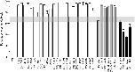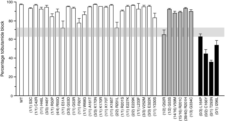 Fig. 1. Sulfonylurea block of wild-type and mutant KATP channels. Percentage inhibition of whole-cell KATP channel currents in wild-type (WT) and mutant (as indicated) channels in response to 0.5 mmol/l tolbutamide. Current in the presence of tolbutamide is expressed as a percentage of that in the absence of drug [2, 9, 11–14]. The numbers in parenthesis indicate the number of patients who responded to sulfonylureas (left) out of the total number (right) with the indicated mutation. White bars, all patients responded; grey bars, some patients responded; black bars, no patients responded. The vertical light grey bar indicates the level of block that separates those patients who responded from those who did not
