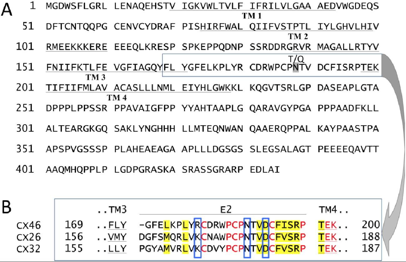 Fig. 1. (A) Amino acid sequence of hCx46. The four transmembrane domains are underlined. The site-directed amino acid replacement at position 188 in the second extracellular loop is indicated as bold letters above the wild-type amino acid, which is marked with a gray box. (B) Alignment analysis of the second extracellular loop domain of hCx46, hCx26 and hCx32, adapted from Ref. [22], [24]. Color-coding: red: residues highly conserved among all connexin members; yellow: homologous residues; blue box: residues mediating inter-connexon interactions such as HBs.