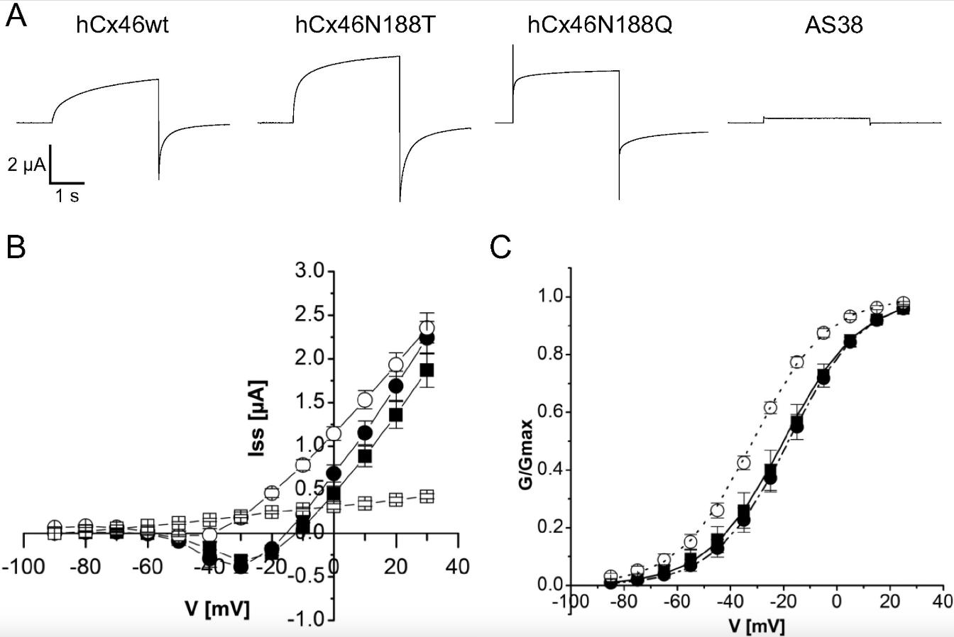Fig. 2. The hCx46 variants formed connexons when expressed in Xenopus oocytes. Xenopus oocytes injected with cRNA encoding for the hCx46 variants were investigated by TEV from a holding potential of − 90 mV, voltage pulses between − 90 mV and +30 mV were applied for 3 s in 10 mV steps. (A) Example of current induced by depolarizing voltage pulses to +30 mV in oocytes expressing the corresponding variants. (B) The current–voltage I(V) plots of current elicited in oocytes, which were injected with cRNA for hCx46wt (■), hCx46N188T (●), hCx46N188Q (○), and AS38 (□) (negative control). The amplitudes of the steady state currents, measured at the end of the voltage pulse, are plotted against the corresponding voltages. The results shown are averages of at least five different oocytes for each variant. The error bars represent the SEM. (C) The conductance–voltage (G(V)) plots of the hCx46wt (■), hCx46N188T (●), and hCx46N188Q (○) hemichannels expressed in Xenopus oocytes. For each experiment, the conductance was normalized to the maximum conductance of each experiment and fitted to the Boltzmann equation. The data points represent the averages of at least five experiments for each variant.