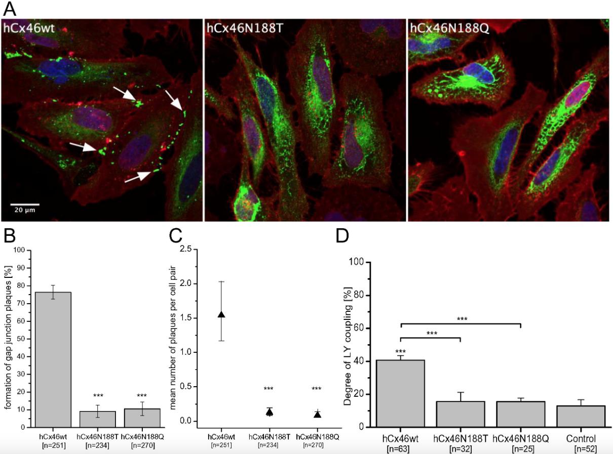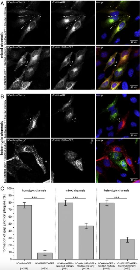 Fig. 5. hCx46N188T reduced the capacity of hCx46 to form gap junction plaques when coexpressed in the same cell or when allowed to form heterotypic gap junction channels. (A and B) Fluorescence micrographs of cells transfected with the corresponding hCx46 variants. The arrows indicate gap junction plaques. (C) Quantification of cell pairs forming gap junction plaques. The diagram shows the percentage of cell pairs, which formed gap junction plaques. The number of analyzed cell pairs for each variant is represented as n. The error bars represent SEM. For statistical comparison between the mutants and the wild type Student's t-test was applied (*** p ≤ 0.001). No statistical significant between the hCx46wt-eGFP and the cultured or cotransfected hCx46wt-eGFP/hCx46wt-mCherry cells could be observed. (note that the data for hCx46wt-eGFP and hCx46N188T-eGFP are the same as in Fig. 3B).
