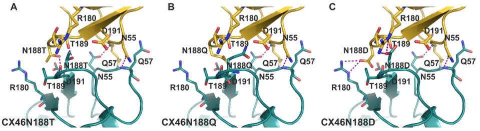The cataract related mutation N188T in human connexin46 (hCx46) revealed a critical role for residue N188 in the docking process of gap junction channels.