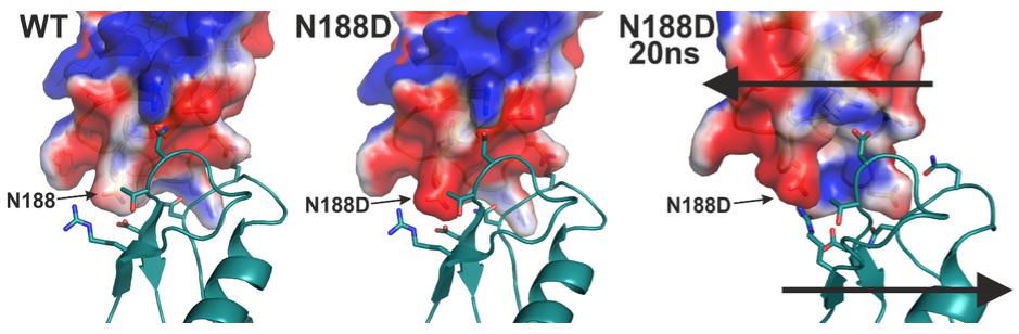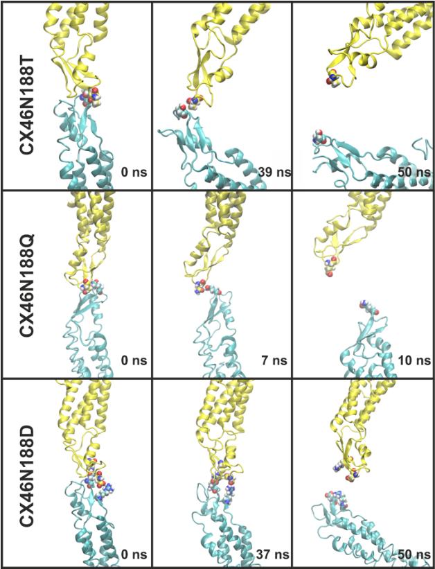 Figure S4: The snapshot sequence shows the electrostatic repulsion of the hCx46N188D mutation with D191.