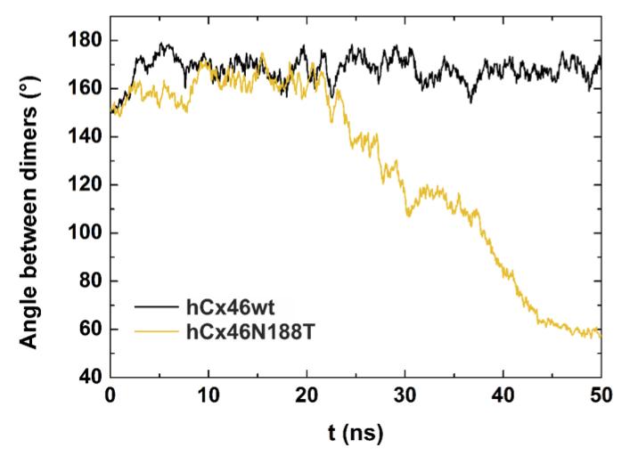 Figure S3: Diagram depicting the angle between the interacting connexins along the simulation tie for hCx46N188T (gold), hCx46wt (black). While the N188T mutation leads to a kinking of the connexins relative to each other and finally to the dissociation of the complex, hCx46wt connexins remain rather constant with an angle around 170 degrees.