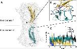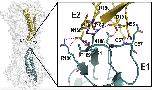 Fig. 6. Structural features of the human connexin46 (hCx46). (A) Homology model of the hCx46 gap junction channel. The two connexon hemichannels are shown in transparent surface representation with the two interacting connexins of each connexon shown as ribbons in gold and cyan, respectively. (B) Close-up view of the binding area between the two connexins (gold and cyan). A tight network of hydrogen bonds (dashed lines, purple) is formed between the amino acid residues of the interacting extracellular loops E1 and E2. (C) Diagram showing the number of hydrogen bonds (HBs) as a function of time along the MD simulations. Note the consistent average number of five HBs, stabilizing the hCx46wt dimer (black), whereas three mutants (blue, gold and cyan) dissociate and lose all HBs at different time points.