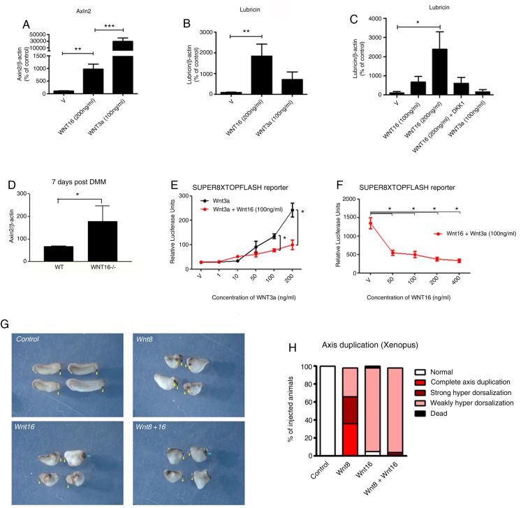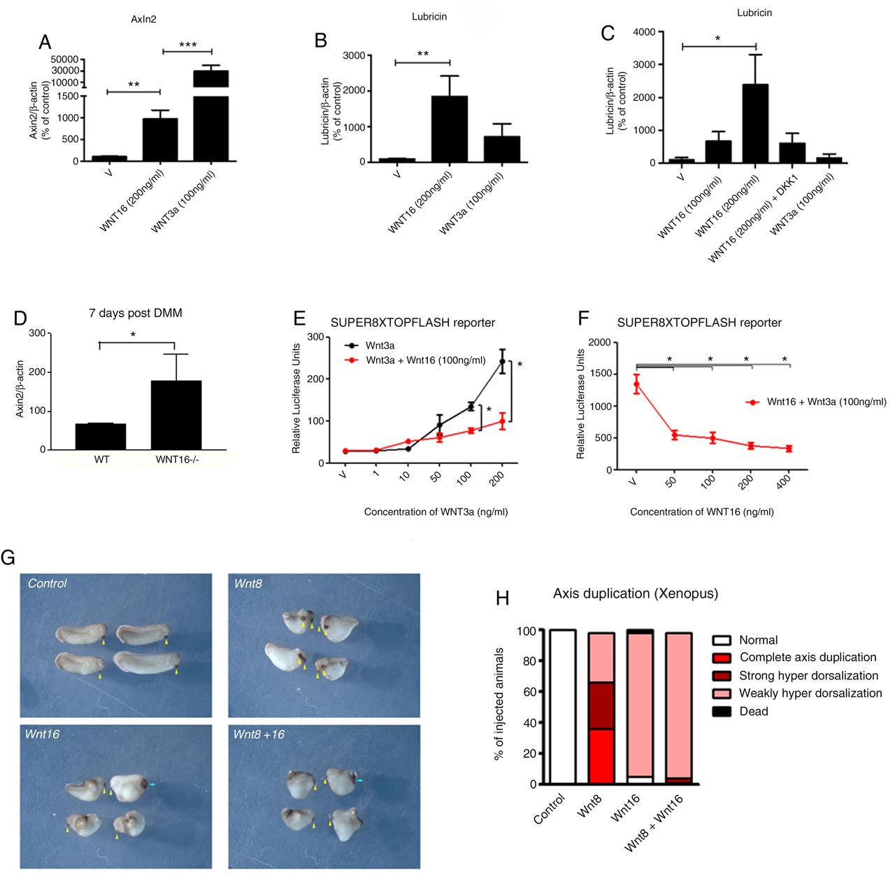 Figure 5. WNT16 is a weak activator of the β-catenin-dependent pathway but also limits its activation by other more potent canonical WNTs. WNT16 caused a weak upregulation of the canonical WNT reporter gene Axin2 compared with WNT3a, in human articular chondrocytes (HAC) (N=3 patients, 4 replicates each) (A). Lubricin expression caused by WNT16 stimulation (ng/mL) in HAC (B), and mouse superficial zone cell (SZC) (C), was higher than that caused by WNT3a stimulation. Lubricin expression decreased in the presence of canonical inhibitor DKK1 (100â ng/mL) in mouse SZC (N=4) (C). All at 24â h. Following destabilisation of the medial meniscus (DMM) surgery, wnt16â/â mice had a higher expression of Axin2 mRNA in their joints (D). WNT16 reduced the capacity of WNT3a to activate the SUPER8XTOPFlash reporter assay in HEK293 cells treated with WNT3a, alone and in combination with WNT16 (ng/mL) (N=4) (E and F). wnt16 inhibited axis duplication caused by wnt8 in Xenopus laevis (G and H). Embryos were injected ventrally with 0.02â ng/µL wnt16 or 0.002â ng/µL wnt8 at the four-cell stage and left for 2â days to develop (n=36â47).