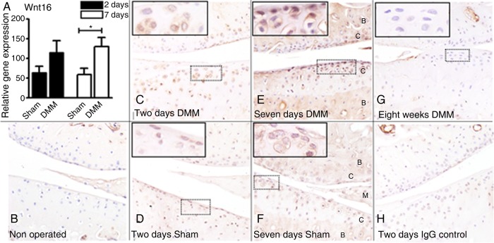 Figure 1. WNT16 is upregulated in experimental osteoarthritis induced by destabilisation of the medial meniscus (DMM). Wild-type mice received DMM of the left knee and sham operation on the right and were killed at 2 days (C and D), 7 days (E and F) and 8 weeks (G) post surgery. (A) WNT16 mRNA was upregulated in the whole joints of DMM-operated mice compared with sham-operated controls, reaching statistical significance after 7 days. WNT16 protein was undetectable in non-operated knees (B), but was upregulated at 2 days following DMM (C) and, to a lesser extent, following sham operation (D). WNT16 expression was further increased in DMM-operated mice at 7 days (E) and to less of an extent following sham operation (F) (joint tissues labelled as follows: C, cartilage; B, subchondral bone; M, meniscus). After 8 weeks, (G) WNT16 was no longer detected in DMM-operated knees. (H) Isotype negative control at the 2-day time point. N=3 per condition.
