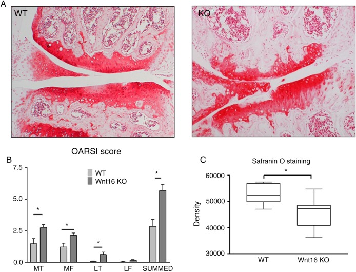 Figure 2. Wnt16−/− mice are more susceptible to instability-induced osteoarthritis. The 10-week-old mice (7 wild-type (WT) and 10 wnt16−/− (KO)) were subjected to destabilisation of the medial meniscus and the outcome was compared 8 weeks following surgery. (A) Safranin O staining of the medial compartment of representative sections. (B) OARSI histological score. (C) Intensity of the safranin O in the medial tibial plateau. LF, lateral femur; LT, lateral tibia; MF, medial femur; MT, medial tibia.