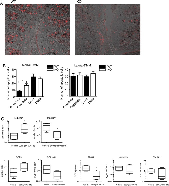 Figure 4. Disruption of WNT16 results in apoptosis of superficial cartilage cells and in the loss of superficial zone molecular markers. Terminal deoxynucleotidyl transferase dUTP nick end labeling (TUNEL) staining of representative sections from the medial compartment of the knee of wild-type (WT) and wnt16−/− mice 2 days after destabilisation of the medial meniscus (DMM) (N=6) (A). The TUNEL staining (shown in red) was superimposed on the Nomarski image for anatomical orientation. Quantification of TUNEL-positive cells in the superficial and deep layers of the articular cartilage within the medial compartment (most affected in DMM) and lateral compartment (mildly or unaffected) (B). Gene expression analysis of superficial zone cells from wnt16−/− mice with or without rescue with exogenous 200 ng/mL recombinant WNT16 (N=4) (C). KO, knockout. *p<0.05.