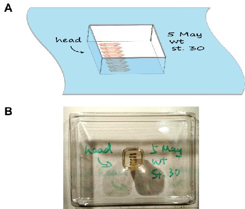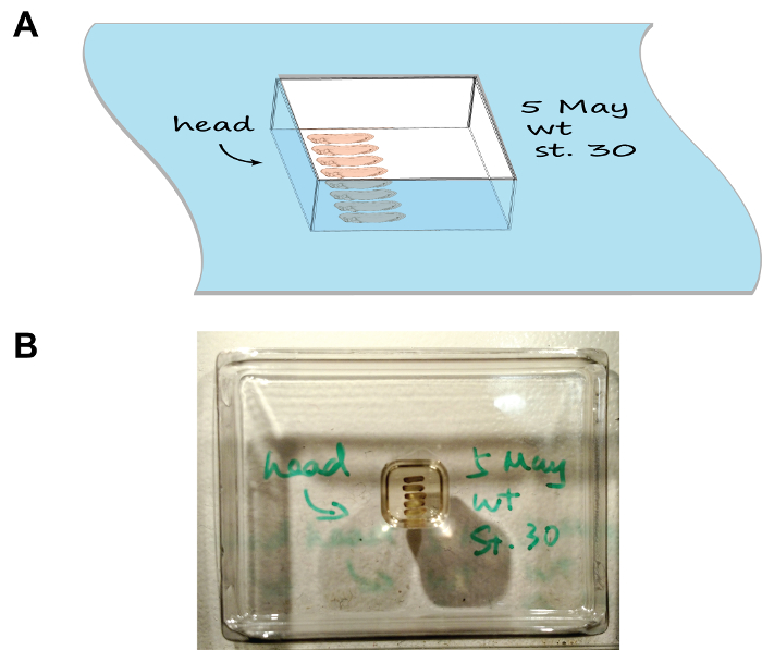 Figure 1: Embryo arrangement and orientation in the section mould. (A) A cartoon depiction showing the mounting assembly, note the tray has been labelled with the date, stage, and the orientation of embryos. (B) An image showing the natural appearance of the mounting assembly.