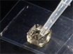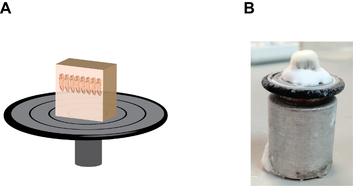 Figure 2: The orientation and position of the gelatin block on the sample holding disc. (A) A cartoon depiction showing the section block assembly, note that embryos are in a heads up position and the gelatin block is firmly fixed onto the sample holding disc by the tissue-freezing medium at the base (see Figure 2B). (B) An image showing the natural appearance of the section block assembly, note the accumulation of the tissue-freezing medium between the gelatin block and the sample holding disc