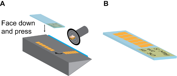 Figure 3: Continuous sectioning. (A) Model of a section chamber. The sample holding disc should be rotated and fixed to the position that the embryo side is facing up. After a few (6-10) sections, the long strip of continuous section tiles are gently separated from the blade (blue) using a fine brush, and then turned 90° on the holding plate. Then a room-temp positively charged slide is firmly pressed onto the section strip facing down and immediately lifted up to collected finished strips. (B) Normally, each slide can accommodate 2 parallel lines of strips, as shown. Remember to make detailed record on the slide label using pencil.