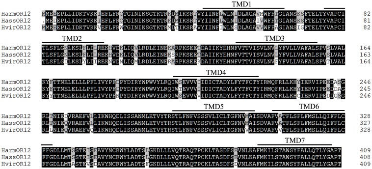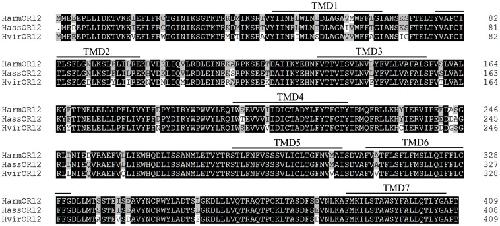 Fig 1. Sequence alignment of OR12 of the three species studied in this work.Percent of identical amino acids ranges between 90 and 98%. The seven transmebrane domains are marked with black lines.