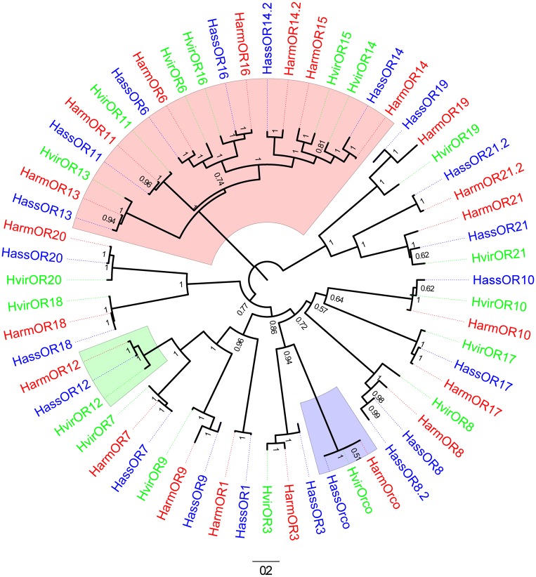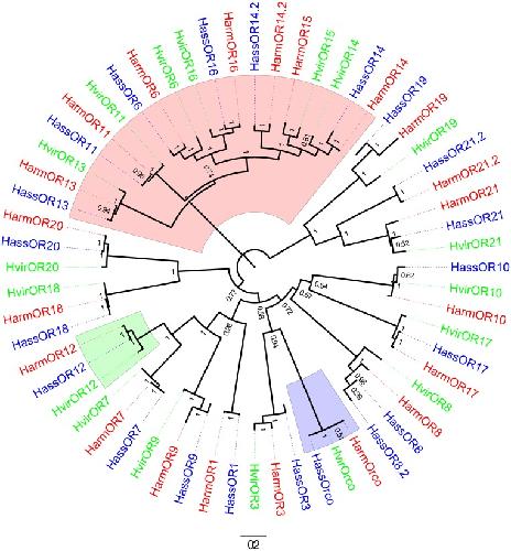 Fig 2. Phylogenetic tree of the ORs of the three species investigated in this work.Harm: H. armigera (red), Hass: H. assulta (blue), Hvir: H. virescens (green). The clade of PRs is highlighted in pink, that of Orco in gray and that of OR12 in light green.