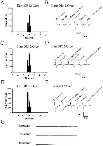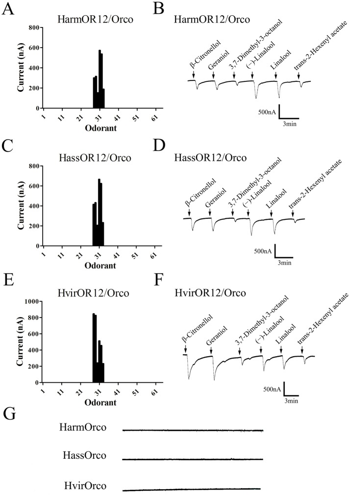 Fig 4. Functional characterization of three OR12/Orco in Xenopus oocytes.(A), (C) and (E) Tuning curves of HarmOR12/Orco, HassOR12/Orco, and HvirOR12/Orco to an odor panel comprised of 61 plant volatile compounds, arranged along the x-axis according to the strength of the response they elicit, with the strongest stimuli near the center. (B), (D) and (F) Inward current responses of HarmOR12/Orco, HassOR12/Orco and Hvir12/Orco Xenopus oocytes in response to 10−4 M solution of tested compounds, respectively. (G) Orco-injected Xenopus oocytes fail to respond to all the tested compounds including the six volatiles. The holding potential was −80 mV.