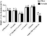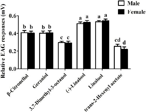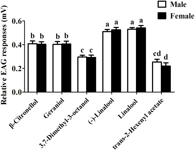 Fig 5. EAG responses of male and female H. armigera to six volatile compounds.The relative EAG response values marked with significant differences (P<0.05) among tested chemicals were analyzed by the general linear model (PROC-GLM) and followed by the least-significant difference (LSD) method. Different letters mean significant differences between components. Values are the averages of 21 biological repetitions for both males and females. Error bars indicate SEM.