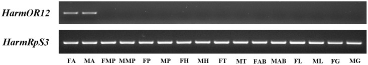 Fig 3. Tissue expression pattern of OR12 of H. armigera.FA: female antenna; MA: male antenna; Fmp: female maxillary palps; Mmp: male maxillary palps; FP: female proboscises; MP: male proboscises; FH: female heads; MH: male heads; FT: female thoraxes; MT: male thoraxes; Fab: female abdomens; Mab: male abdomens; FL: female legs; ML: male legs; FG: female genitalia; MG: male genitalia.