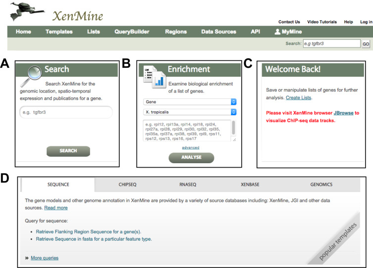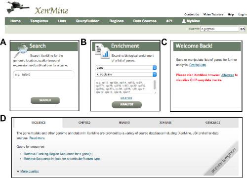 Fig. 1. An illustration of the XenMine homepage. (A) Enter a gene name to access the Gene page report. (B) Enter a list of genes to determine GO and publication enrichments. (C) Click to input, save, view and compare lists, or to be taken directly to JBrowse. (D) Popular Template queries can be found here and under the Templates button at the top of the page.