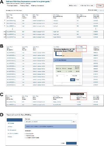 Fig. 3. Sorting and filtering data to obtain biological information. A) The search template Retrieve RNA-Seq expression scores for a given gene retrieves a table with 117 rows showing the expression of dazl in all experiments available on XenMine. (B) The distribution of expression values can be displayed in graph form, allowing the user to choose the desired range of expression values; in this case, from 50 to 186 (red box). (C) The Expression Scores column can be sorted in descending order by clicking the arrow button, highlighted in the red box. (D) The data can be downloaded in multiple formats or exported to Galaxy or GenomeSpace by clicking on the Export button found at the top of the results table (highlighted in the red box in A).
