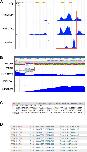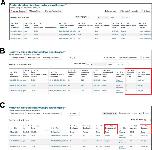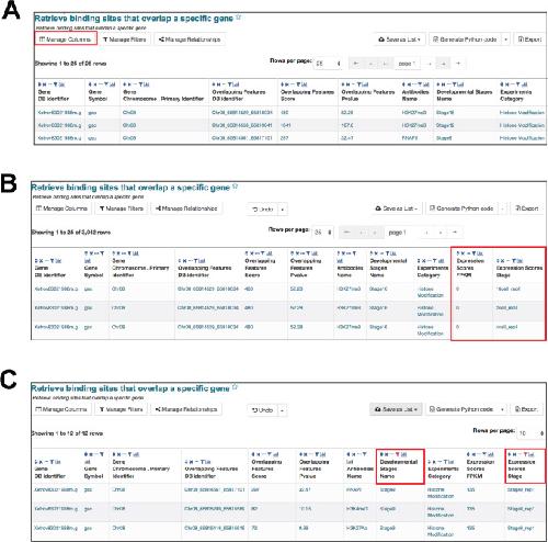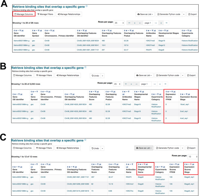 Fig. 5. Manipulating the results table for desired output. (A) From the template Retrieve binding sites that overlap a specific gene, we find the called ChIP-Seq peaks near the gsc gene. By clicking on Manage Columns, outlined in the red box, we add the data of interest, in this case RNA-Seq expression data (see Supp. Fig. 3). (B) The added columns can be seen in the resulting table, highlighted in the red box. (C) Filtering the highlighted columns for Stage 9 results in the ChIP-Seq peaks associated with the gsc gene when it is expressed.