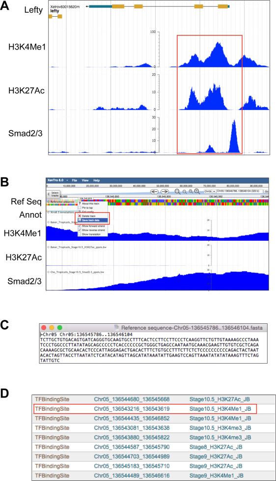 Fig. 2. Analysis of ChIP-Seq datasets. (A) ChIP-Seq peak tracks at the lefty locus visualized in JBrowse that indicate the presence of a putative enhancer. The red box outlines a regioncentered at the gene of interest, containing peaks for histone marks H3K4Me1, H3K27Ac and the transcription factor Smad2/3. (B) By selecting a region of interest, users can download track data from the reference sequence (Ref Seq) track by clicking on the arrow next to the RefSeq track and selecting Save Track Data, highlighted in the red box. (C) Track data is downloaded in FASTA format for further analysis. (D) Transcription factor and histone mark peaks are annotated on the Gene Page Reports. The link for each peak gives detailed information about this genomic region, including the source of the data, the peak height and score and any overlapping features within the peak.