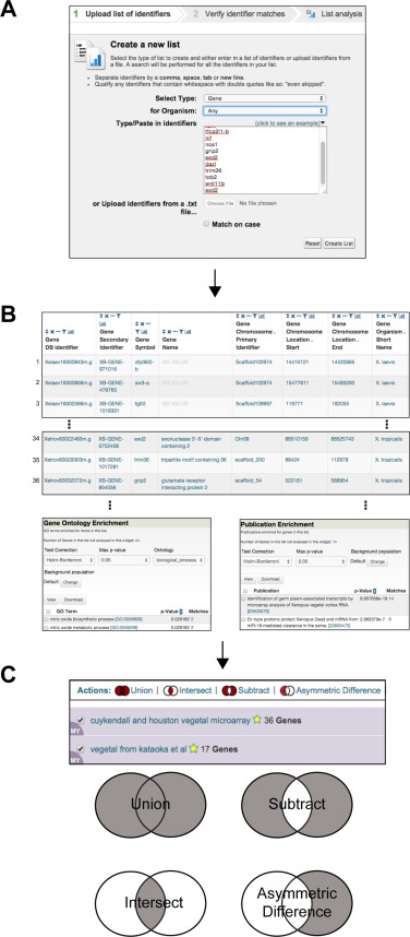 Fig. 4. Comparisons of datasets. (A) Under Lists on the XenMine homepage, users can manually enter or upload a list of genes for analysis. (B) XenMine automatically returns details of the genes, including genomic coordinates, along with GO Enrichment Publication Enrichment. (C) Lists saved in MyMine can be compared using the Union, Intersect, Subtract, or Asymmetric Difference tools.