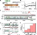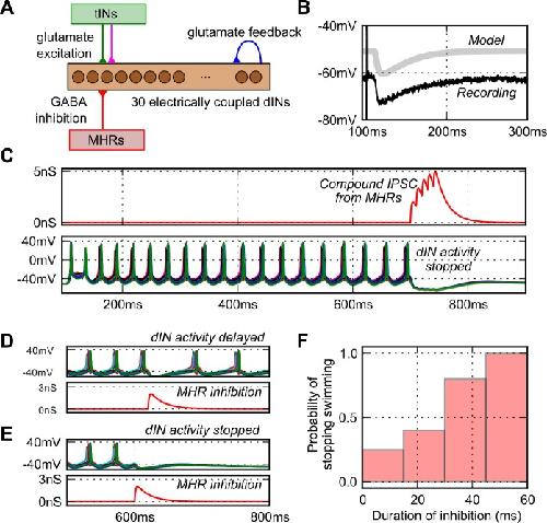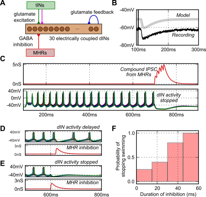 Fig 6. Switching off the swimming network using synaptic inhibition.(A) The dIN network with MHRs to inhibit all dINs synchronously. (B) The model GABA-A IPSP in a dIN (light grey, offset by 10 mV) matches the time-course of recorded MHR IPSP in a spinal neuron (black; Perrins et al. (2002) [29]). (C) Sensory activated rhythm generation in the dIN network (lower voltages traces), is turned off at 700 ms by five IPSPs from the MHR pathway (red conductance trace) in each dIN. (D, E). A single inhibitory synaptic event delivered to all the dINs simultaneously could delay (D) or terminate firing (E). Lower red traces show the inhibitory conductances onto a single dIN. (F) Stopping became more reliable as inhibition was made longer.