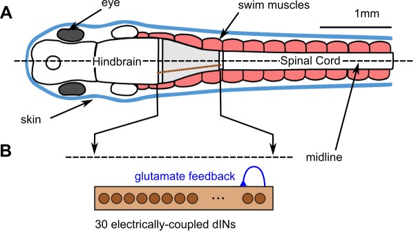 Fig 1. The hatchling tadpoleCNS with a population of electrically-coupled dIN neurons.(A) Top view diagram of tadpole showing skin (blue), swimming muscles (pink), and CNS with hindbrain and spinal cord. The CNS region able to generate swimming rhythm when isolated (grey) contains a population of â¼30 dINs (brown) on each side. (B) On each side of the nervous system, the electrically-coupled population of ~30 dINs in the isolated region make excitatory feedback NMDAR synapses onto each other.