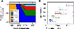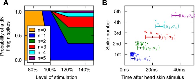 Fig 2. A simple generative model of spike times for a single tIN.(A) The probability distribution of a single tIN firing different numbers of spikes at levels of head-skin stimulation. (B) The times of the spikes measured experimentally are shown as coloured crosses and the means and standard deviations (μk and σk) used to generate the spike times of a model tIN. Means are shown as coloured circles, standard deviations are shown as horizontal error bars.