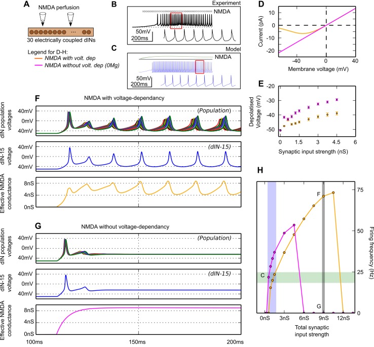 Fig 3. Perfusing NMDA onto the dIN population model.(A) The population of electrically-coupled dINs, onto which NMDA was perfused. (B) In life, perfusion of NMDA onto a dIN causes depolarisation and repetitive firing (black traces from Fig 2 in Li et al., 2010 [19]) where hatched bar denotes NMDA perfusion. Red box shows region expanded below. (C) Similar firing is seen in a model dIN (blue trace) where green line shows the NMDA activation reaching a maximum conductance of 1 nS. (D) Current-voltage curve of a single model dIN NMDA synapse, with (yellow) and without (pink) voltage dependence. (E) The steady state membrane potentials of dINs as a function of NMDAR conductance (with sodium channel conductance set to zero to prevent firing) with and without voltage dependency of the NMDAR as in D. (FâH) The response of the network of 30 dINs to NMDA perfusion with (F) and without (G) voltage dependency. Top: somatic membrane voltages (all dINs overlapped), middle: somatic membrane voltage of dIN number 15, bottom: conductance of NMDAR synaptic channels. (H) Plots of dIN firing frequency vs NMDAR conductance with (yellow) and without (pink) voltage dependence. Grey bar shows synaptic strength used in plots F and G (7.5nS). Blue bar shows estimated total synaptic conductance to a neuron during swimming, based on voltage clamp recordings (0.6â1.5nS). Green area shows the range of swimming frequencies observed in the tadpole.