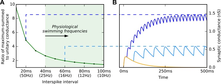 Fig 4. Summed conductance of feedback NMDAR synapses as a function of frequency.(A) Spike trains of different frequencies were delivered to a model NMDAR synapse with a closing time of 80 ms, and the maximum conductance recorded experimentally. (B) Faster spike trains produced a larger maximum conductance. At the frequencies of tadpole swimming, the conductances did not rise above ~3 times the conductance of a single NMDAR synaptic event (yellow trace).