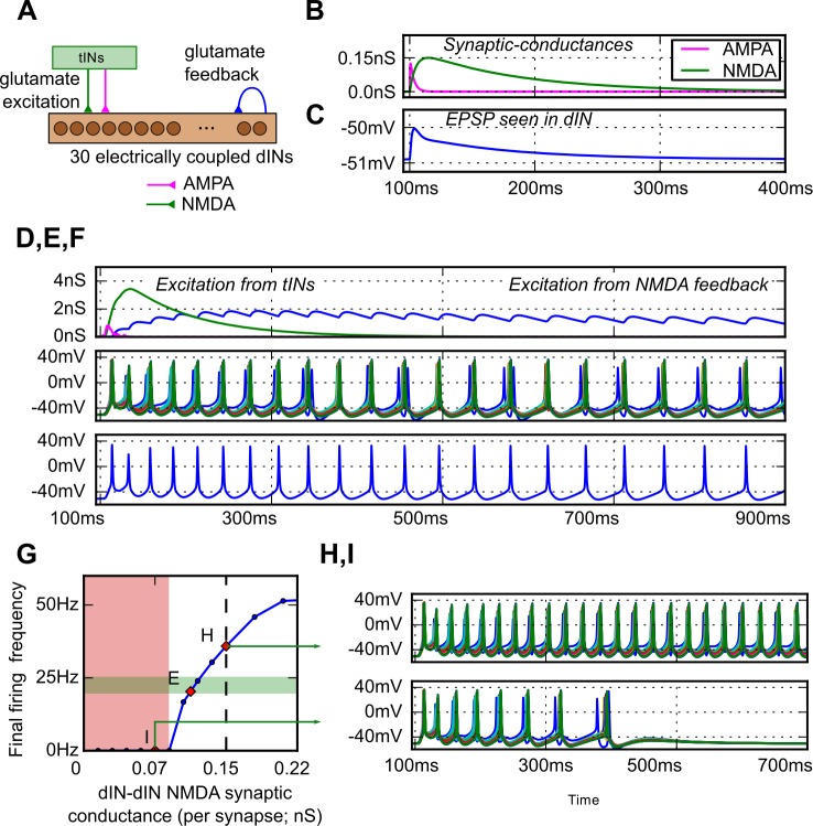 Fig 5. The response of a dIN network with feedback glutamate excitation to brief sensory excitation.(A) The network of 30 electrically-coupled dINs excited by sensory pathway tINs and with feedback glutamatergic synapses. (B) The conductance time-courses of the feedback dIN excitation with faster AMPAR (magenta) and slower NMDAR (green) components. (C) The resulting combined dIN to dIN EPSP. (DâF) Response to sensory input from tINs at 100 ms. (D) The conductance of sensory synapses onto one dIN (magenta: AMPAR, green: NMDAR) and summed NMDAR conductance from dIN feedback (blue). (E) After firing once to sensory input from the tINs, the dIN network shows rhythmic activity within the tadpole frequency range driven by feedback NMDAR excitation (0.11nS/synapse). (F) A single dIN voltage trace from E. (G) The effect of dIN to dIN NMDA feedback conductance on dIN firing frequency (conductance values are for a single dIN to dIN synapse). Rhythmic firing at physiologically observed frequencies is observed (green area). At low levels of synaptic strength, swimming is not reliable (red area, I). (H) At higher levels of feedback synaptic strength (0.15 nS/synapse) firing is outside normal tadpole range. (I) At lower feedback strengths (0.07nS/synapse) rhythmic firing cannot self-sustain and activity ceases after a few cycles.