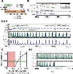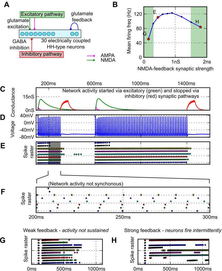 Fig 7. Generalising the feedback excitation activity generation mechanism.(A) The network with HH neurons replacing dINs (on/off; 100 ms/300 ms, 600 ms/1400 ms). (B) The effect of synaptic feedback strength on neuron firing (green shows regions of unstable firing). (C—F) Network activity can be switched on and off by brief synaptic input. (C) Shows the excitatory (green: NMDA, magenta: AMPA) and inhibitory (red) input to the network. (D) Voltage trace of activity in one neuron. (E—F) Shows a raster plot of action potential times for every 5th neuron in the network. (G—H) Raster plots of 10 neurons in a network with excitation at 100ms and without inhibition. (G) When feedback conductance was too low (gpeak = 0.15 nS); the network was unable to sustain rhythm. (left, green region of B). (G) When NMDA feedback strength was too high (gpeak = 2 nS), firing became unreliable.