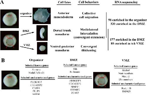 Fig. 1. Schematic representation of the RNA-seq experiment. A) The early organizer from stage 10+ embryos and the dorsal and the ventral marginal zone (DMZ and VMZ) explants from mid-gastrula stage embryos were dissected and subjected to RNA sequencing. Cells in these regions have distinct fates and motile behaviors. Pairwise comparison of differential expressed genes was performed between the organizer and the DMZ, and the DMZ and the VMZ, samples. The ANOVA-like analysis for all three samples sets was also performed, which produced similar results as that in the pairwise comparison. Genes with potential to regulate embryonic patterning and/or movements were especially scrutinized in more detail in this study. B) A list of the selected known and uncharacterized genes with differential expression patterns in different embryonic regions is shown.